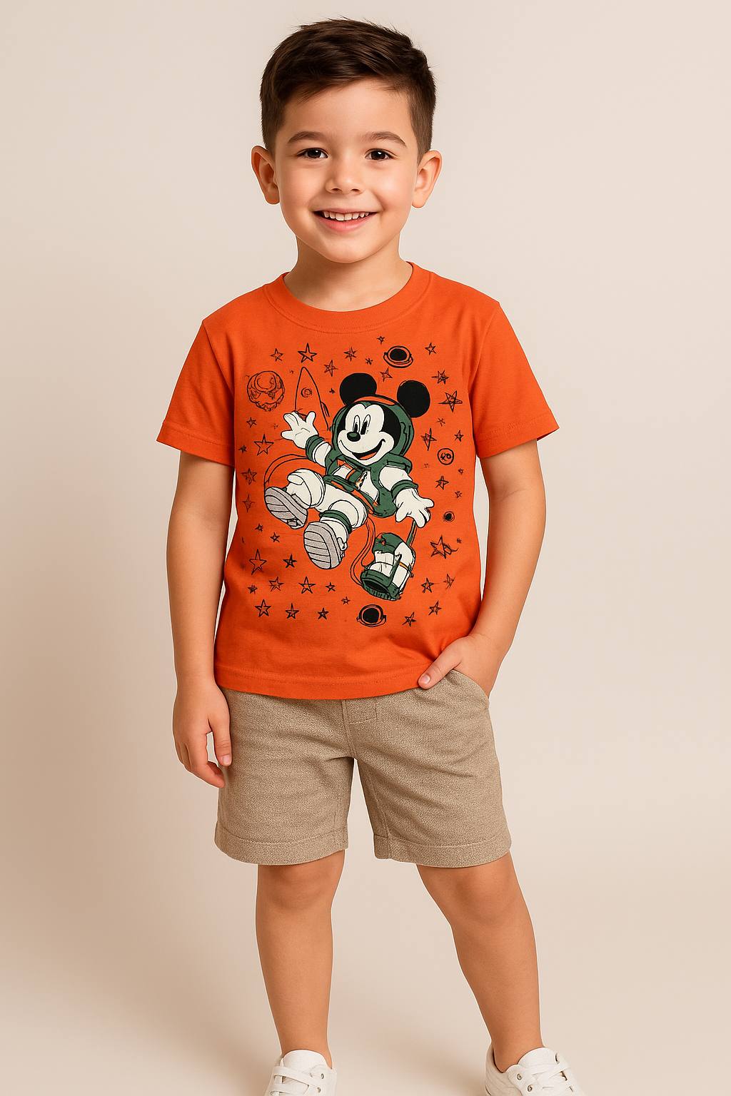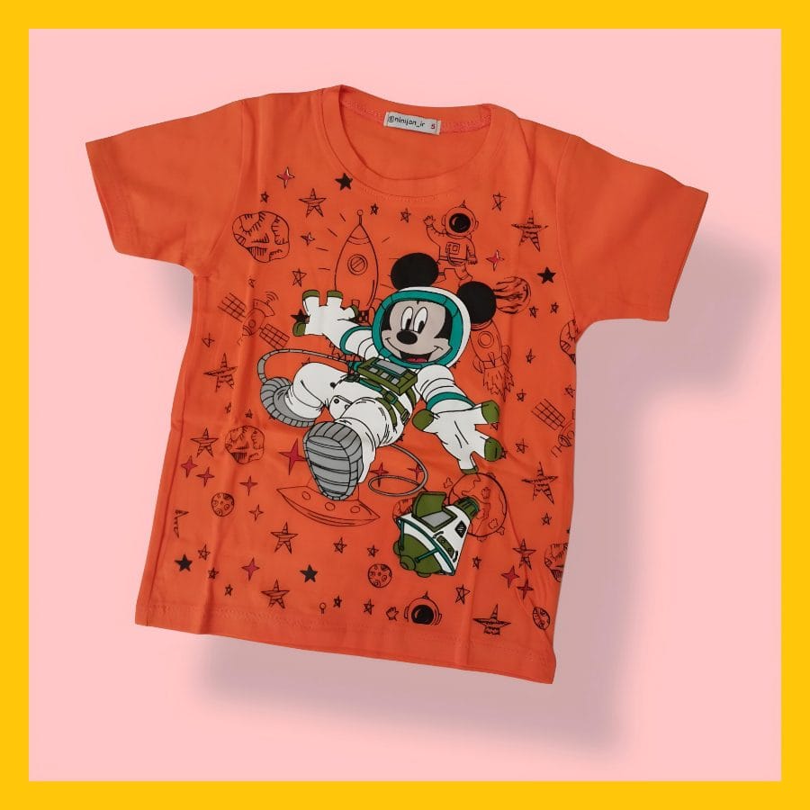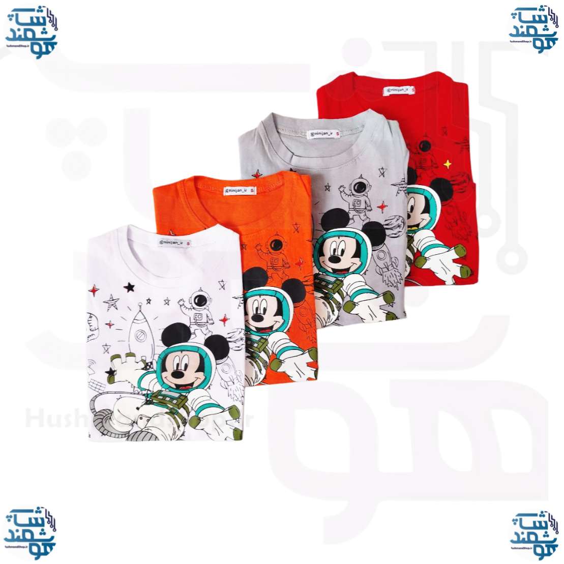 تیشرت طرح میکی موس در چهار رنگ نارنجی و خاکستری و قرمز و سفید موجود است